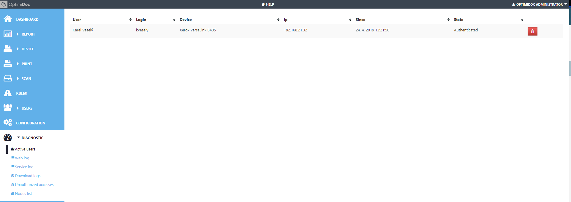 Active user list provides an overview of currently authenticated users on devices. The list shows only authenticated users on devices with authentication to device.