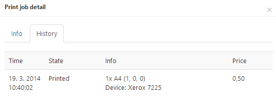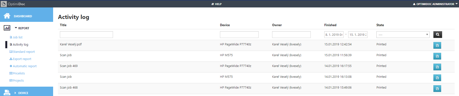 Activity log provides information about the current activities in system. Administrator can view print, copy and scan jobs which were processed in specific devices. He can immediately see the status of the job and watch the preview of all pages. Activity log is also available for users who see only their jobs.