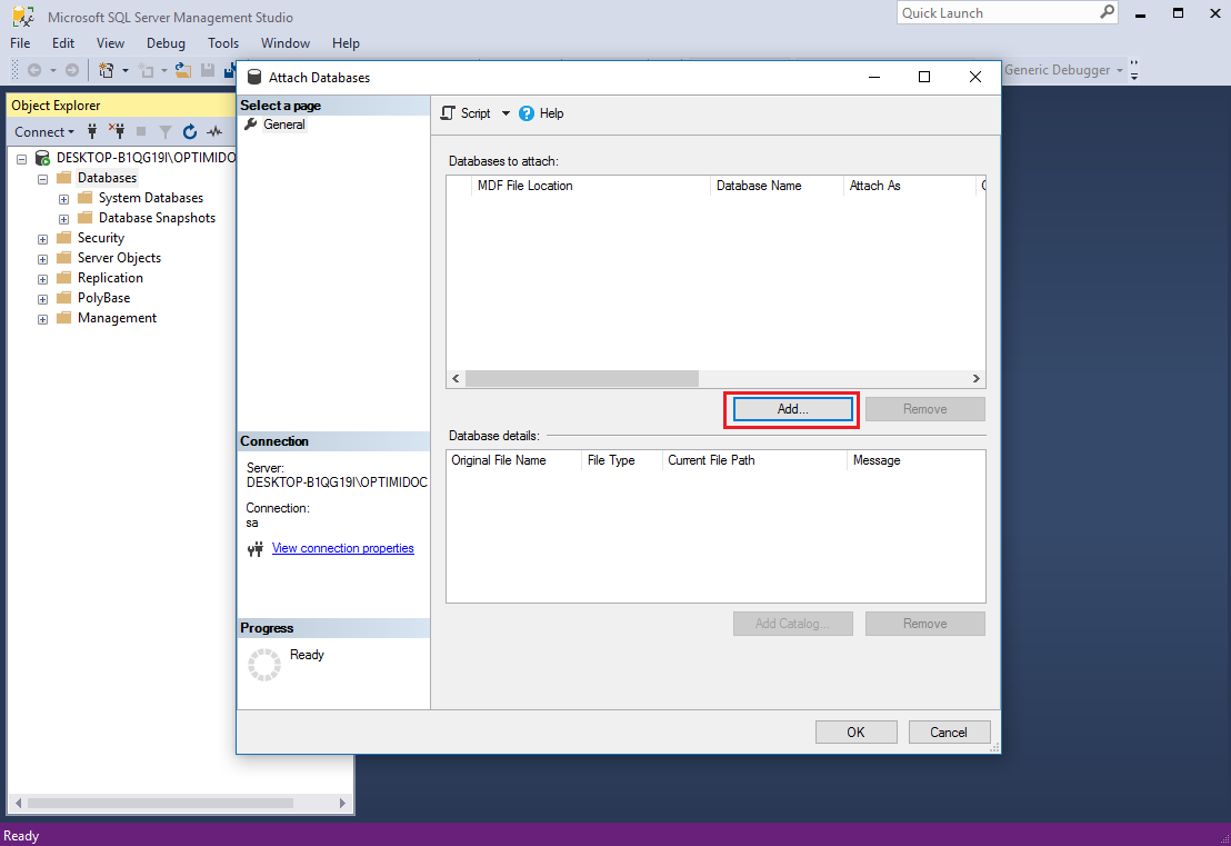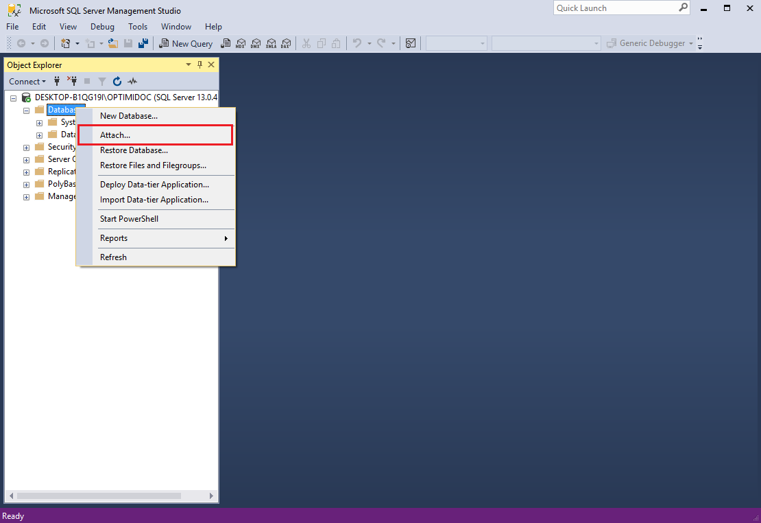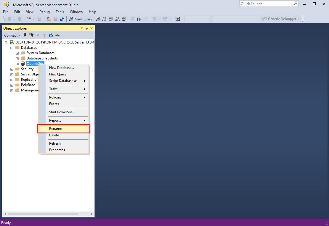 6. Right-click on new attached database and rename it to "OptimiDoc" |