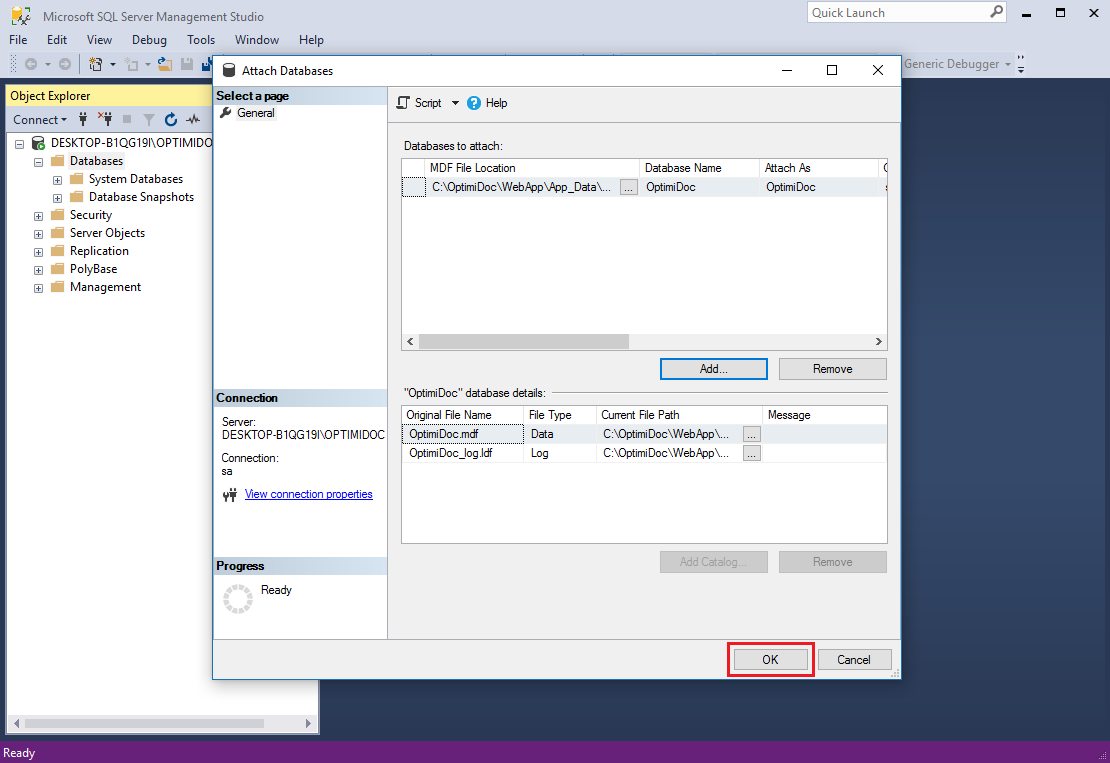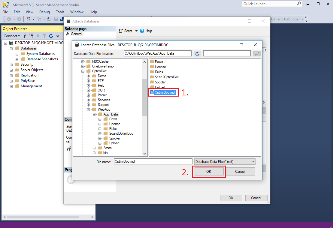 Go to OptimiDoc\WebApp\App_Data and right-click on OptimiDoc.mdf and choose properties, click on tab Security, and change permissions by button Edit. Select user who is logged in Microsoft SQL Server Management Studio, and Allow all permissions for him.