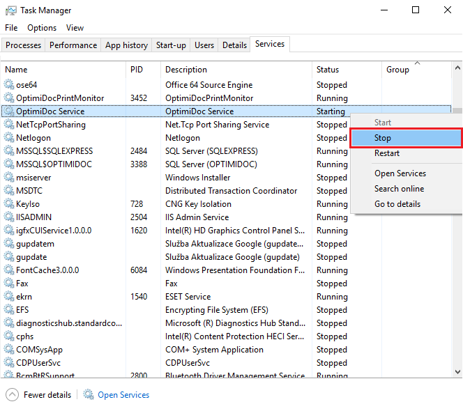 Before launching Microsoft SQL Server Management Studio, stop OptimiDoc Service in Task Manager (in Services) and OptimiDoc in ISS Manager.