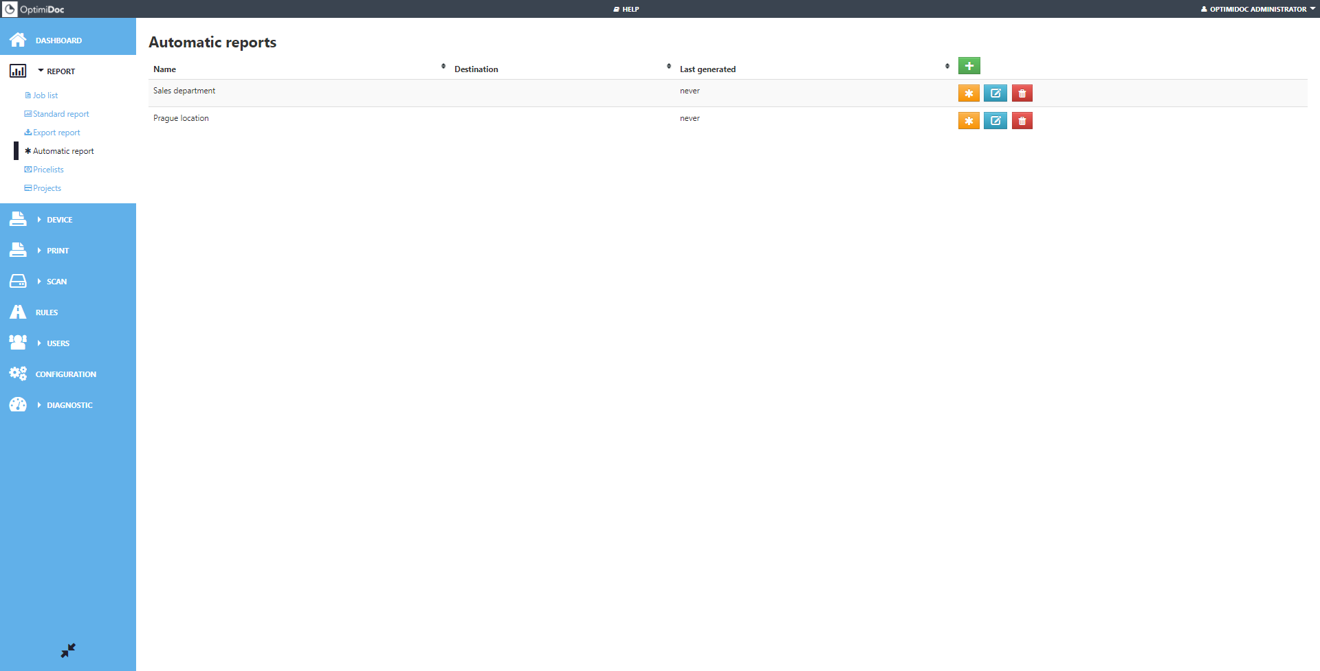 List of automatic report destination provides basic overview of all defined reports. From this page you can add new report, edit or delete created reports or generate them.
