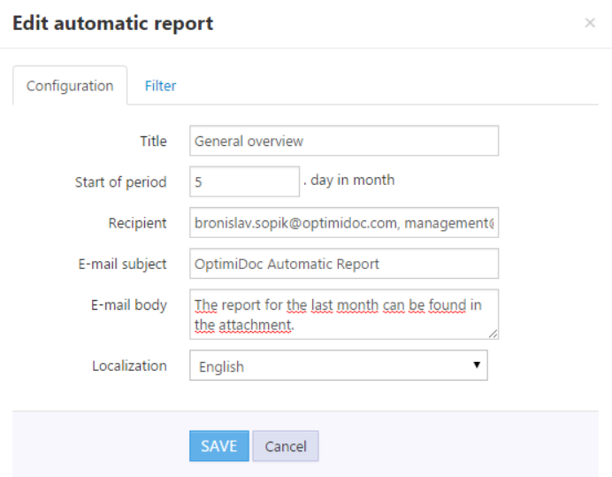 Automatic reports create an Excel file including the complete overview of statistics for last month. Automatic report is generated the day after the end of a period (see Start of period in the table below) at 12:00.