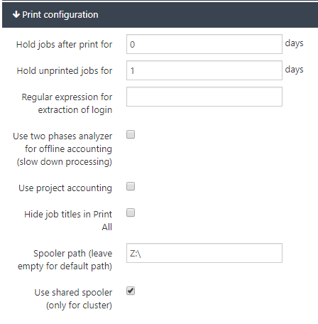 - Use shared spooler - enables the shared spooler (only for cluster). All servers have to be configured to use shared spooler or none. It is not possible to have e.g. 3 servers and two of them configured to use shared spooler and third as standalone