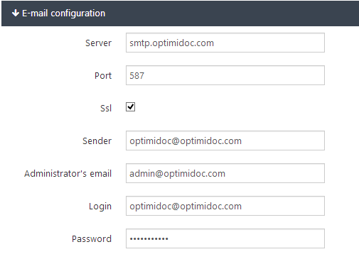 OptimiDoc configuration page contains all required settings. Complete setting is spitted to areas and to open the settings click on the selected area name.