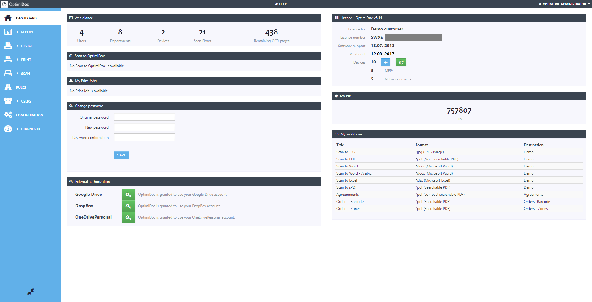 After login Dashboard is the first displayed page. It provides the basic overview of OptimiDoc system and configuration. The content of dashboard is collected from multiple widgets.