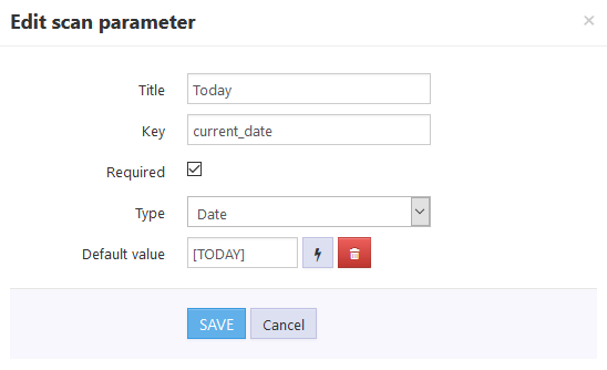 OptimiDoc web interfaceScanScan parameters Date Date parameter enables users to enter the date information. Title - title of parameter Key - key which will be used in naming or destination. To use the parameter selected value put to the field [parameter_key] Required - if the parameter input is required Type - type of parameter Default value - predefined value which can be preselected date, current date or empty to preselect date Click on to select current day of scanning Click on to clear the date and leave the field empty Click on