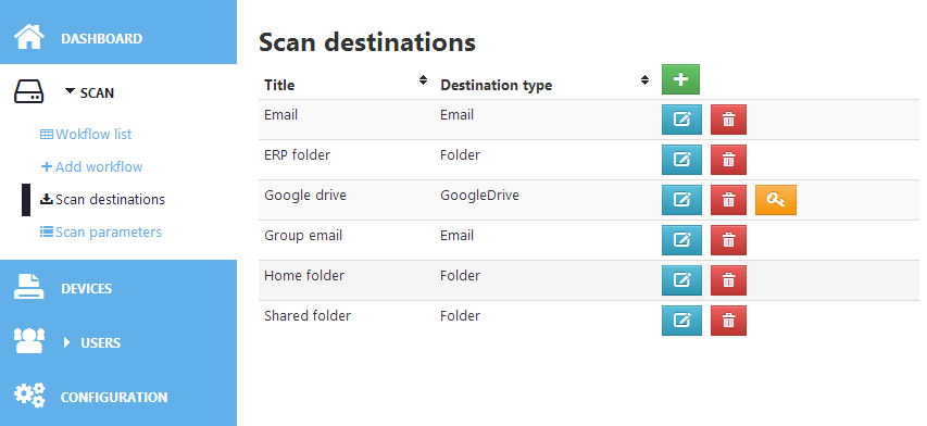 List of scan destination provides basic overview of all defined scan destinations. From this page you can add new destination, edit current destinations or delete them.