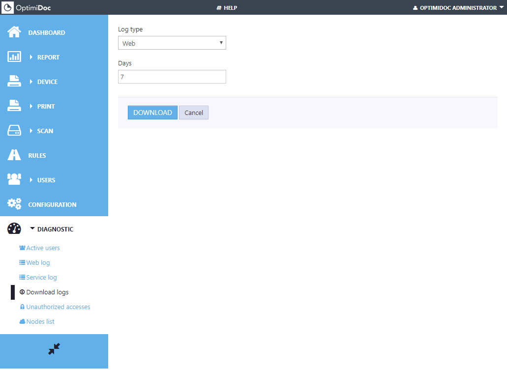 OptimiDoc web interfaceDiagnostic Download logs Via download logs page you can download logs for web site or service directly from web interface. To download logs please select: Log type - Web/Service Days - how old logs shall be put to download file