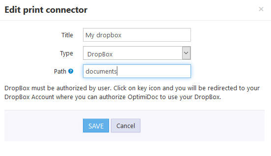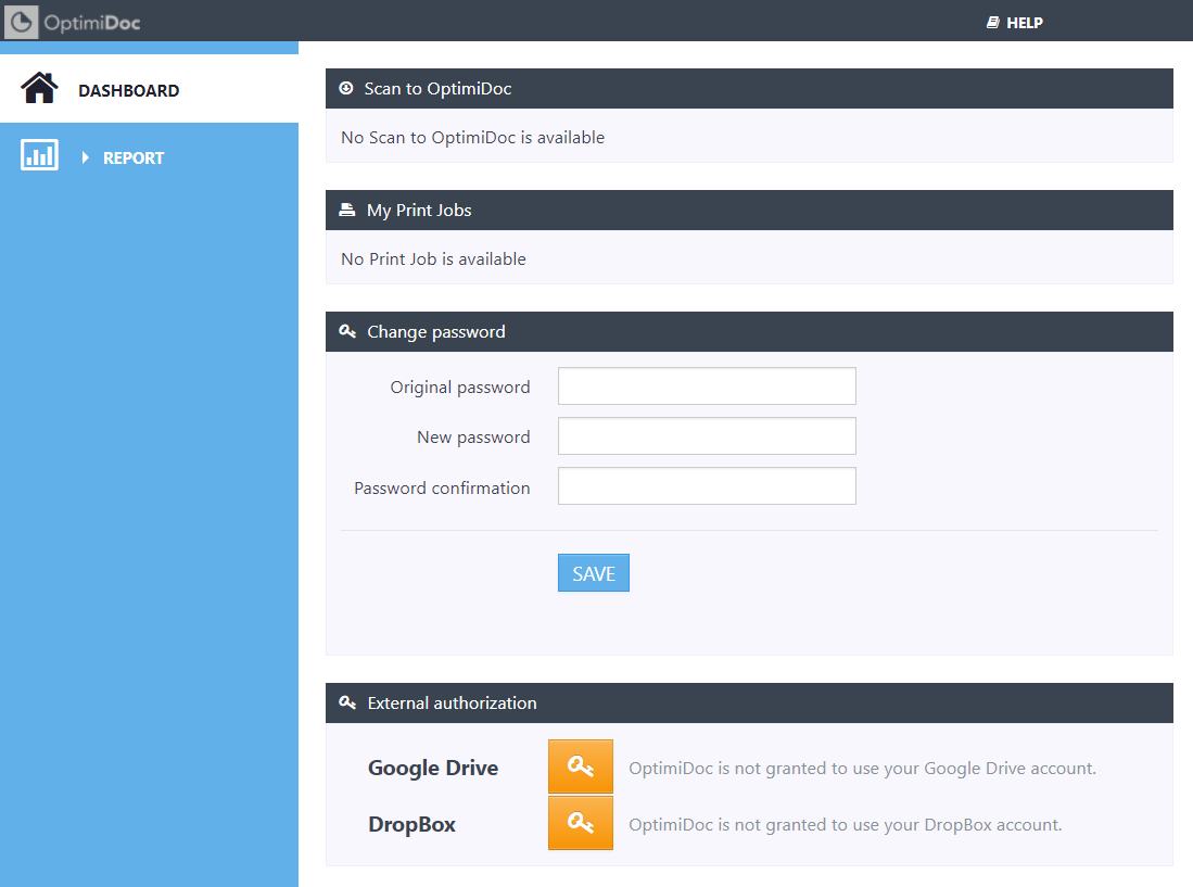 When the standard user will log into OptimiDoc web, there is shown DropBox authorization on the bottom of dashboard. |