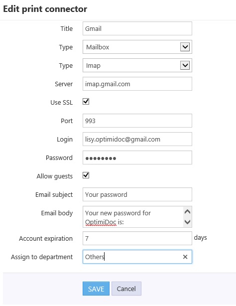 Title - destination title Type - type of print connector Type - protocol of email server (IMAP/POP3) Server - IP address or domain name of mail server Port - server port number Use SSL - enable/disable SSL Login - login name for mailbox/domain user Password - password for mailbox/domain user Allow guests - enable guest printing E-mail subject - subject of email which will be sent to guest with info about created PIN E-mail body - body of email message. To place the PIN number please use parameter {0} Account expiration - definition of account validity period Assign to department - definition of department where guest account will be assign |