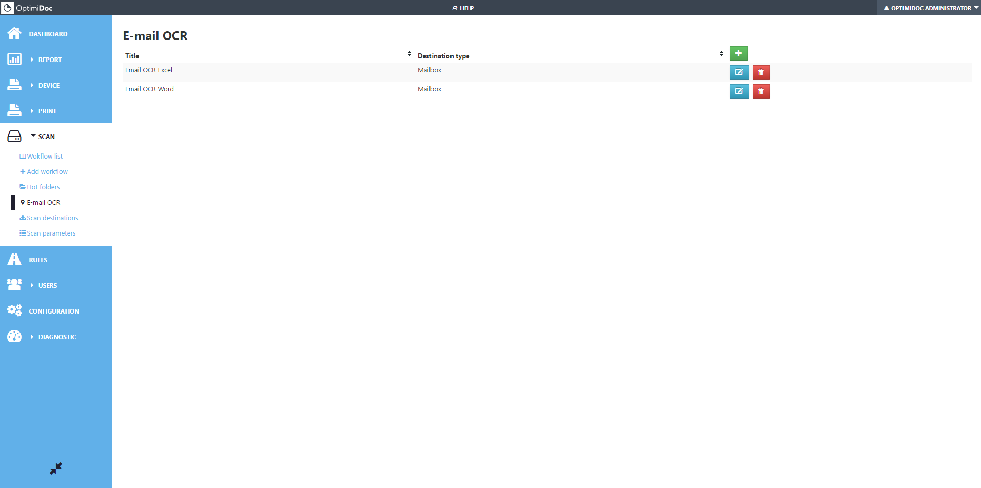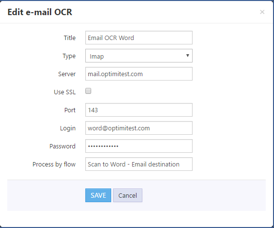 E-mail ORC flow uses previously created Scan workflow to process e-mail attachment. So you can create new Scan workflow particularly for e-mail OCR or use current one. While creating or using created Scan workflow don't forget where you have specified, that the document should be stored or sent. You can also create new or use created Destination for Scan workflow.