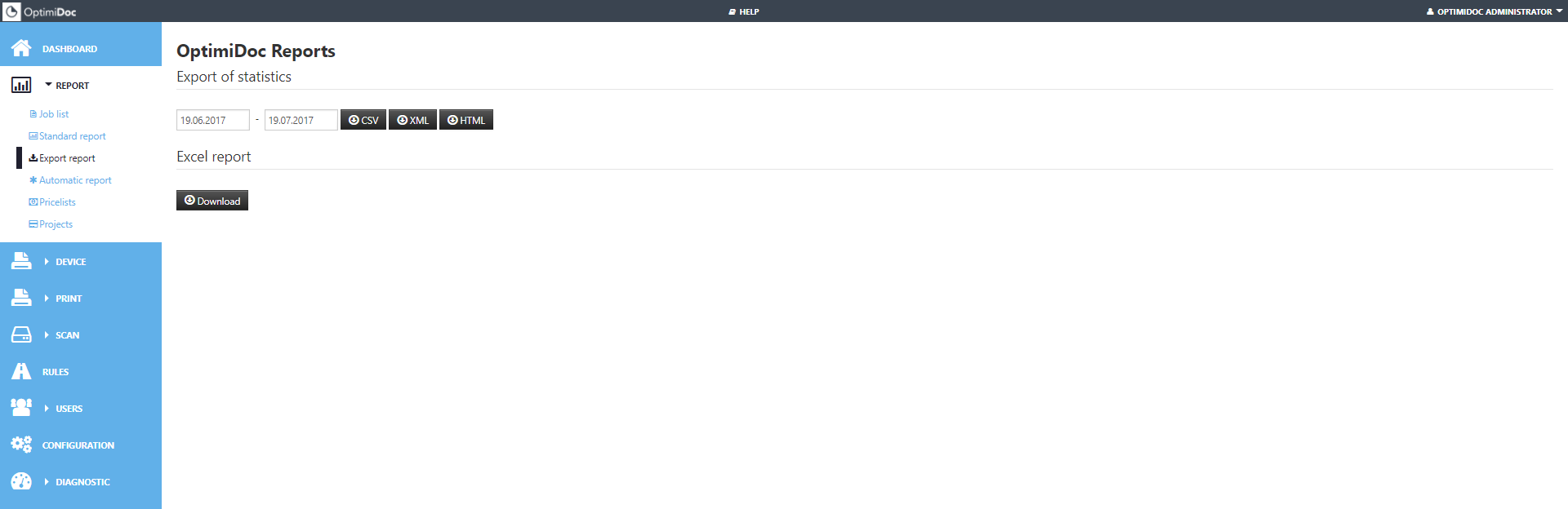 To export reports select dates from and until you want to get data. Select the export format by Click on CSV, XML or HTLM button.