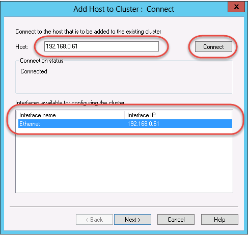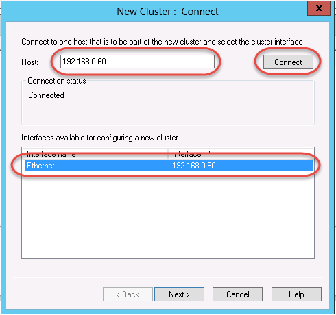 4. Enter the IP address of first cluster node, Click on connect and select the network card. Confirm by Click on Next. |