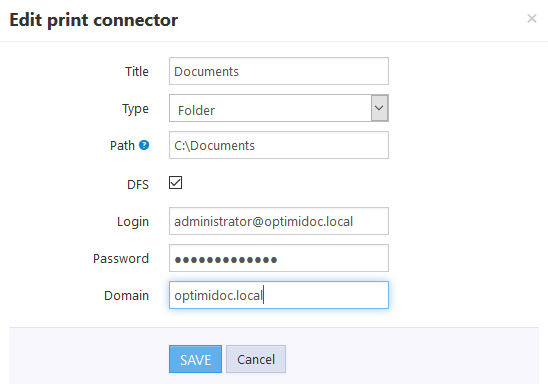 Title - destination title Type - type of print connector Path - path to required folder where shall be the document stored DFS - check if the destination Distributed File System Login - user login name Password - user password Domain - computer domain in case of local computer without connection to domain use the name of computer Overwrite existing file - if you check this option than the files with same names in destination will be overwritten. Otherwise the OptimiDoc leaves existing file and new saves with suffix |