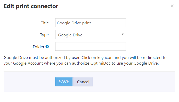 2) Fill labels Title - destination title Type - choose "Google Drive" Folder - folder in selected Google Drive. |