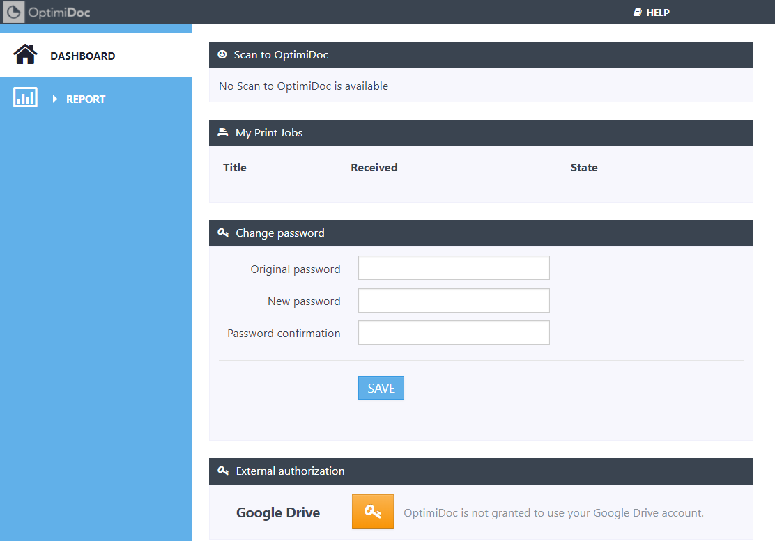 When the standard user will log into OptimiDoc web, there is shown Google drive authorization on the bottom of dashboard. |