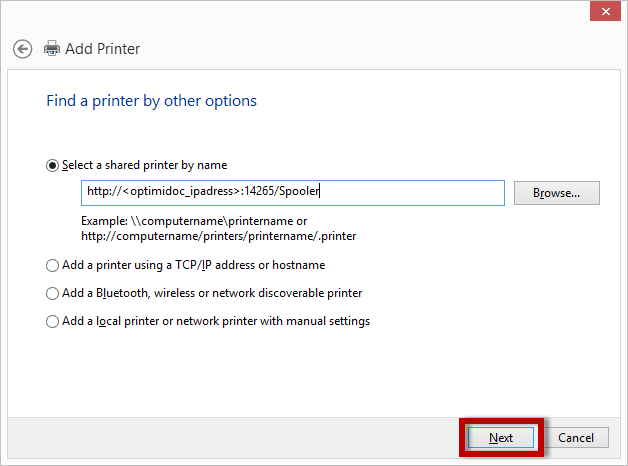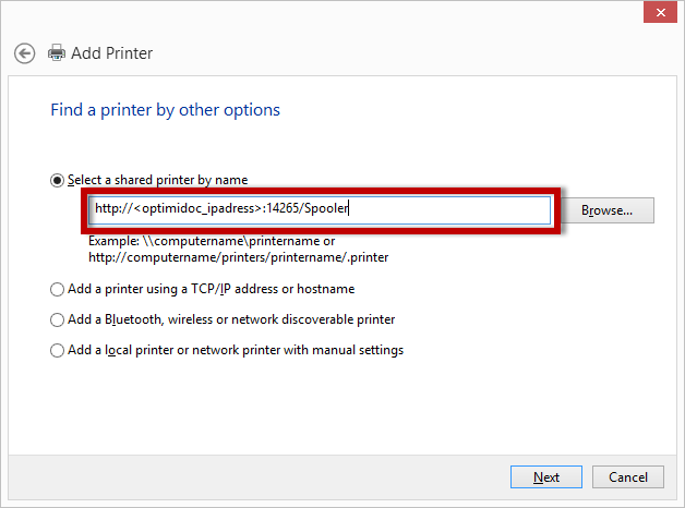 4. Enter the OptimiDoc address to field in Select a shared printer by name. Default address is http://<optimidoc_ipadress>:14265/Spooler |