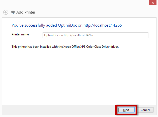 7. System installs new printer and presents confirmation window. Click on Next. |