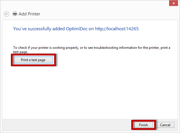 8. You can send test page to OptimiDoc by Click on Print a test page button or confirm the printer installation by Click on Finish button. |