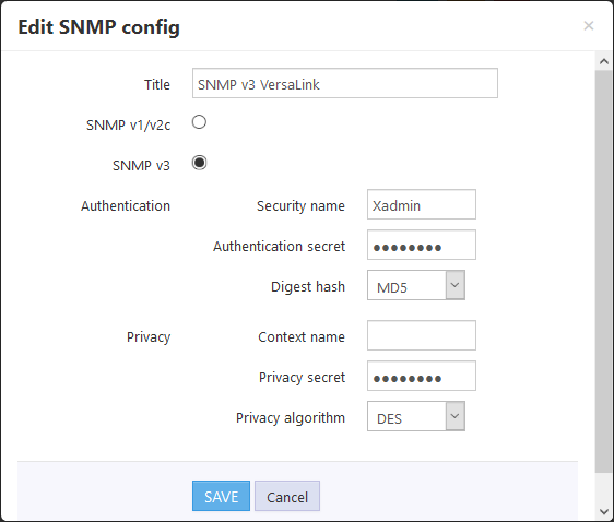 As a next step create new SNMPv3 configuration in OptimiDoc based on the information from previous step.