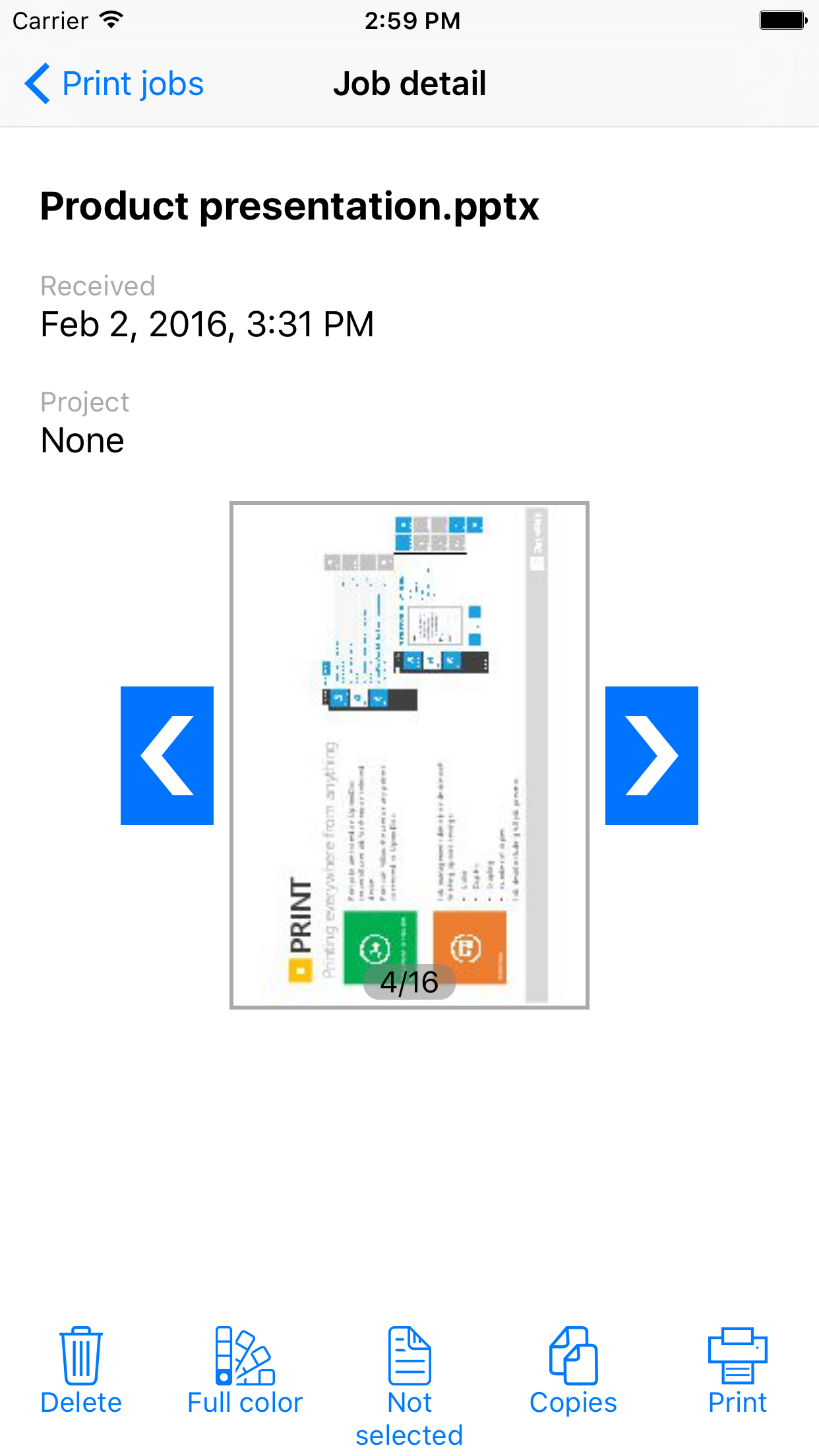 OptimiDoc Mobile Job details To close the job details, tap the icon in the top left corner The first line of text is the name of the job Received - date and time on which the print job was received on the OptimiDoc server Project - the project this print job belongs to. For more information about projects, see Projects The image in the bottom is the preview of the print job Tap or to switch pages You can also swipe the image to the left or right to switch pages The current page and the total amount of pages are displayed at the bottom of the preview Buttons in the button bar on the bottom: 1st button deletes selected jobs 2nd button changes the color print option Full color - documents will be printed in color Monochrome - documents will be printed in black and white 3rd button changes the plex print option Not selected - the default settings will be used simplex - one sided print Vertical duplex - two sided print along the short edge of the paper Horizontal duplex - two sided print along the long edge of the paper 4th button changes the amount of copies that will be printed 5th button sends the print job to a printer see also: Printer selection