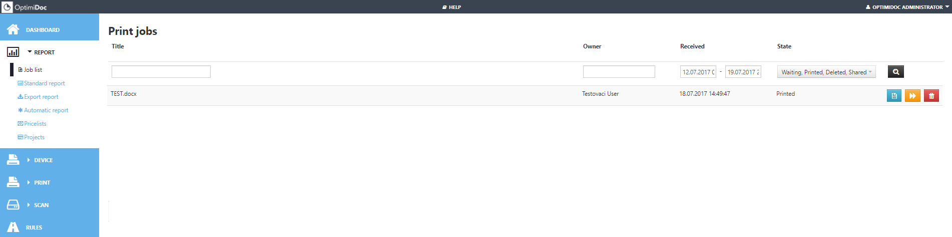 Job list provides information about the current activities in system. Administrator can view and manage print, copy and scan jobs. He can immediately see the status of the job if it was printed and how many times or watch the preview of all pages. Job list is also available for users who see only their jobs.