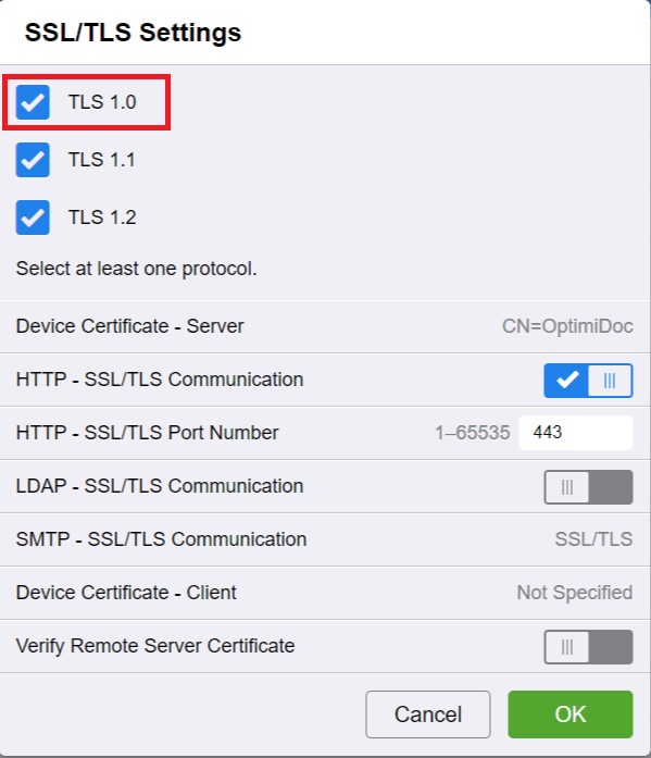 Supported devicesXerox device configurationXerox VersaLink models Latest firmware SSL problem Within the latest Xerox VersaLink firmware you need to allow TLS 1.0: Go to System/Security settings There choose SSL/TLS Settings And then allow TLS 1.0