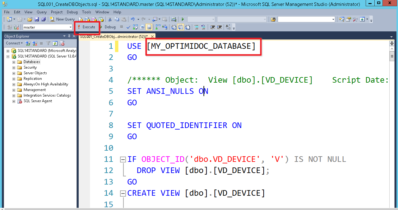 2. Open SQL001_CreateDBObjects.sql 2.1. On the first line, replace [OPTIMIDOC] with the name of your OptimiDoc database instance. 2.2. Execute the script. |