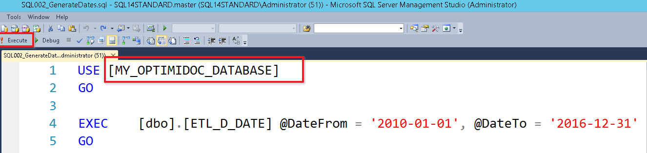 3.Open SQL002_GenerateDates.sql 3.1. On the first line, replace [OPTIMIDOC] with the name of your database instance 3.2. If necessary, change the values in the @DateFrom and @DateTo variables to the desired period. Note: Data outside this range will not be loaded into the data cube. 3.3. Execute script. |