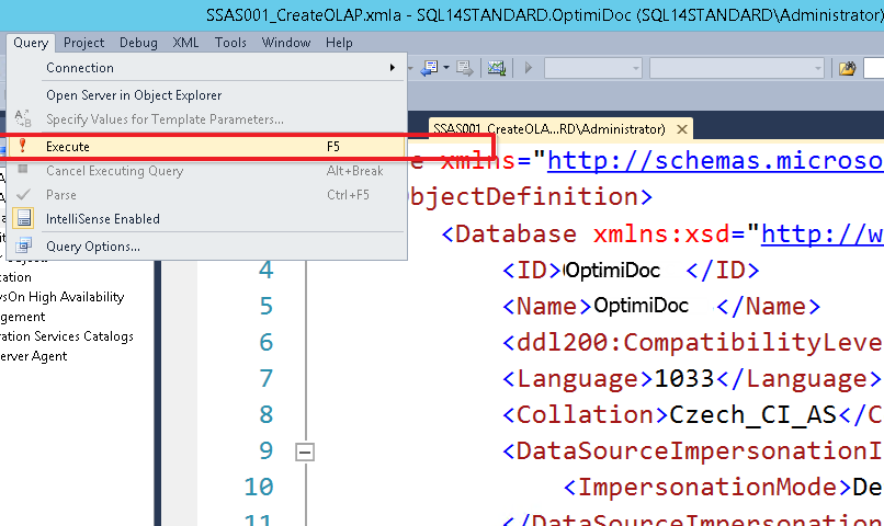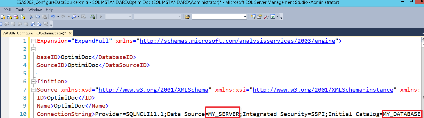 6.Open SSAS002_ConfigureDataSource.xmla and perform the following steps: 6.1. On line <ConnectionString> replace localhost with the name of the server 6.2. On line <ConnectionString> replace OPTIMIDOC with the name of your OptimiDoc database. 6.3. Execute script. |