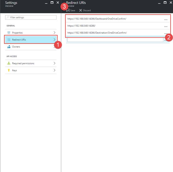 6. Configure the redirect url. Add 2 next redirect URL https://<server_IP>:14266/Dashboard/OneDriveConfirm/, https://<server_IP>:14266/Destination/OneDriveConfirm/ |