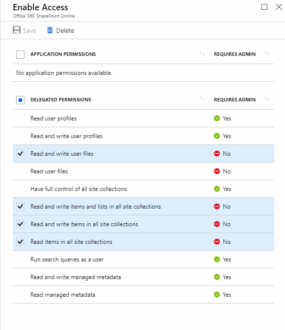 5. Select the Microsoft.SharePoint API and in permission select rights based on image bellow and Click on done. |