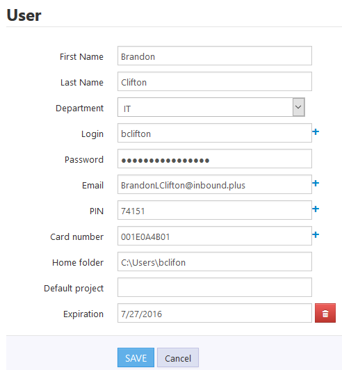 2. Enter the user data: - First name - Last name - Login - the value is used for assignment of print jobs. The value shall be the same as the user has for authentication to workstation. - Password - user password - *Email - user email for delivery of scans - *PIN - enter the PIN if you want to use it for authentication to the device - *Card number - enter the card number if you know it and want to use it for authentication. - *Home folder - enter the home folder if you want to use it for delivery of scans. |