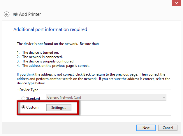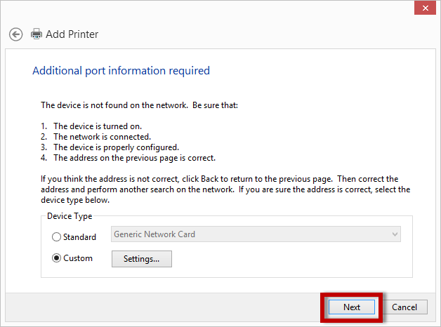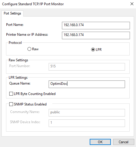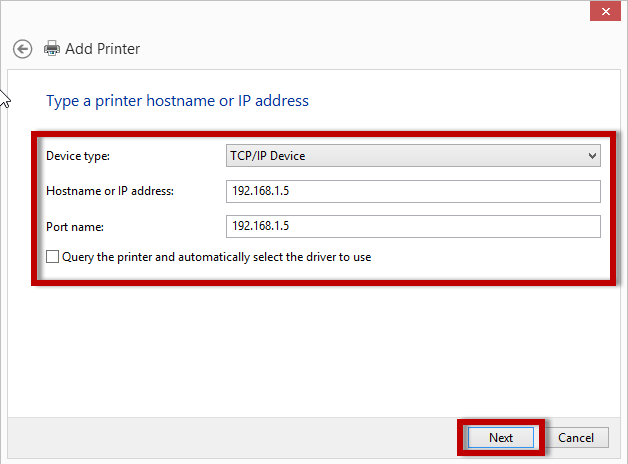 5. Change the device type to TCP/IP device, enter the OptimiDoc hostname or IP address and uncheck the option to query the printer. Click on Next button. |
