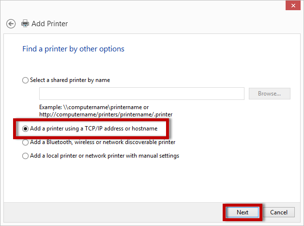4. Select Add printer using a TCP/IP address or hostname and Click on Next button. |
