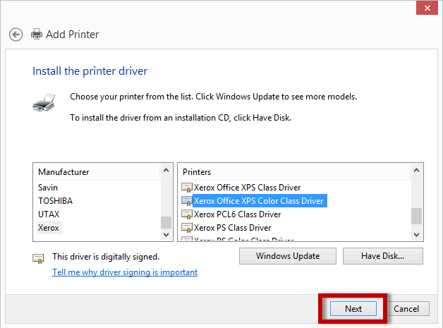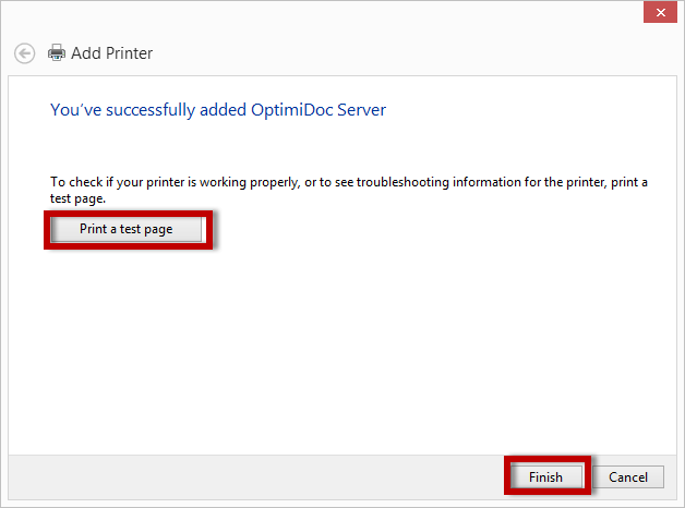 11. Send test page to OptimiDoc by Click on Print a test page button or confirm the printer installation by Click on Finish button. |