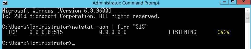 Open command prompt. Type: netstat -aon | find "515" . This will show us if the port "515" is used by other service than OptimiDoc Service. We can see that process ID (PID) 3424 is using port "515" |