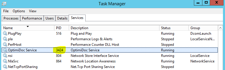 Now check what process is using port "515" in Services. OptimiDoc service is working with port "515" so its necessary the service is connected to this port. |