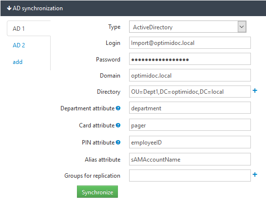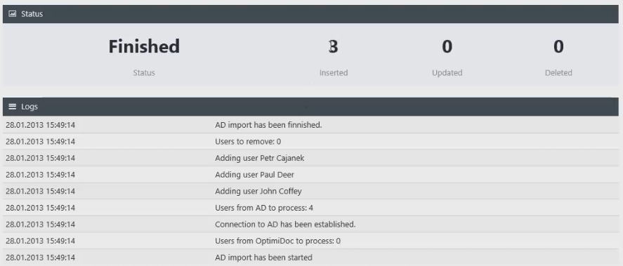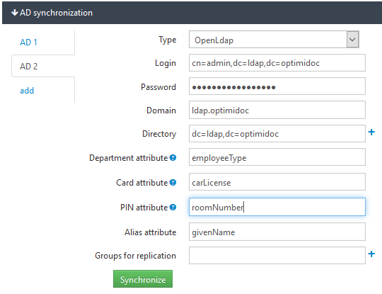 OptimiDoc offers the automatic synchronization of users from Active Directory (AD), OpenLDAP or CSV file. To import the user it is necessary to define AD or OpenLDAP configuration or CSV file and start the synchronization.