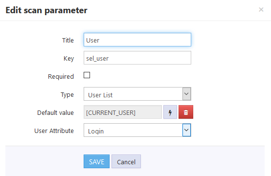 - Default value - predefined value of parameter can be empty or currently logged user. To select currently logged user Click on