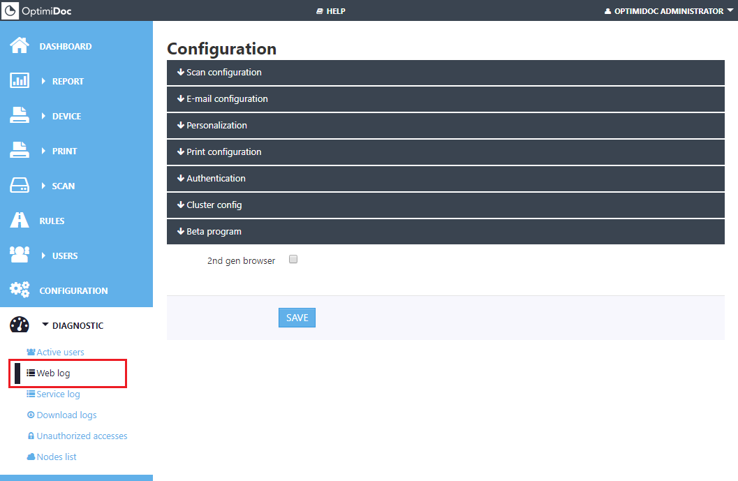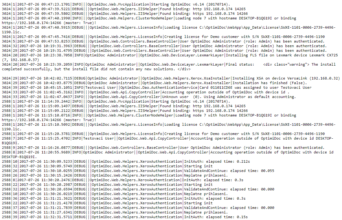 If you click on Web log in Diagnostic topic, Internet browser opens a new tab with list of operations which OptimiDoc applications did. Every step of application you can see with time when operation was done and with description of operation.