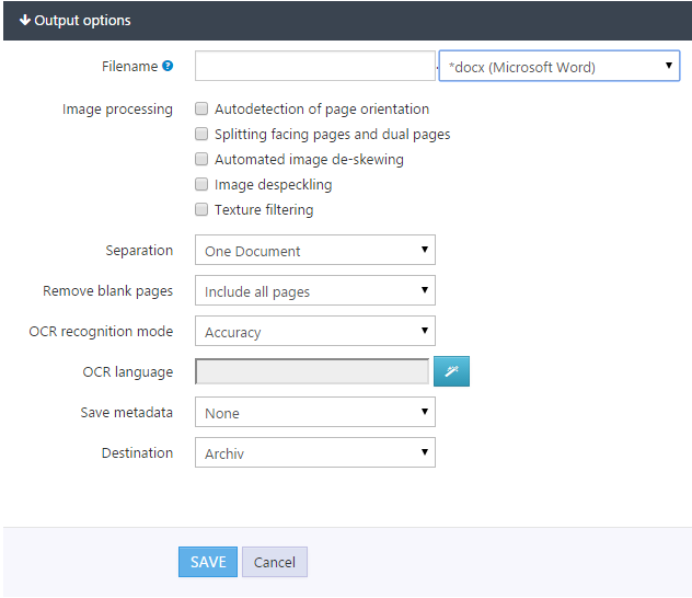 Output option defines the document processing and distribution.
